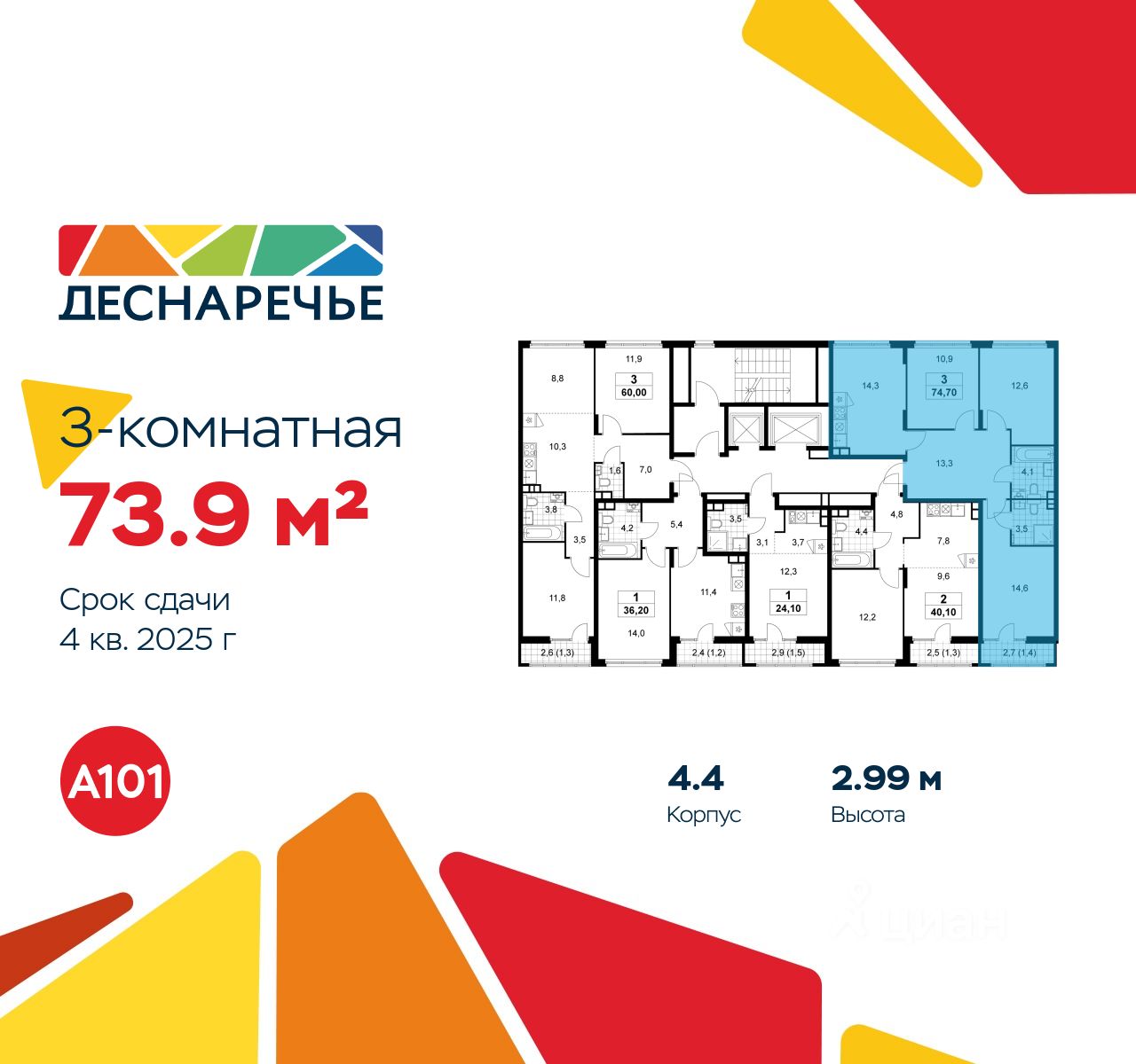 Продается трехкомнатная квартира 956 в новостройке ЖК "Деснаречье" по адресу Москва, ТиНАО, Новомосковский АО, Десеновское С/П, Десна деревня, Москва, район Троицк, ЖК Деснаречье, к. 4.4. Общая площадь квартиры - 73.90 кв. м., этаж 15 из 15, секция 12. Тип проекта, по которому построен дом - монолит, компания-застройщик - ООО "А101". Стоимость квартиры - 25954419 Р. Срок сдачи - 4 квартал 2025.