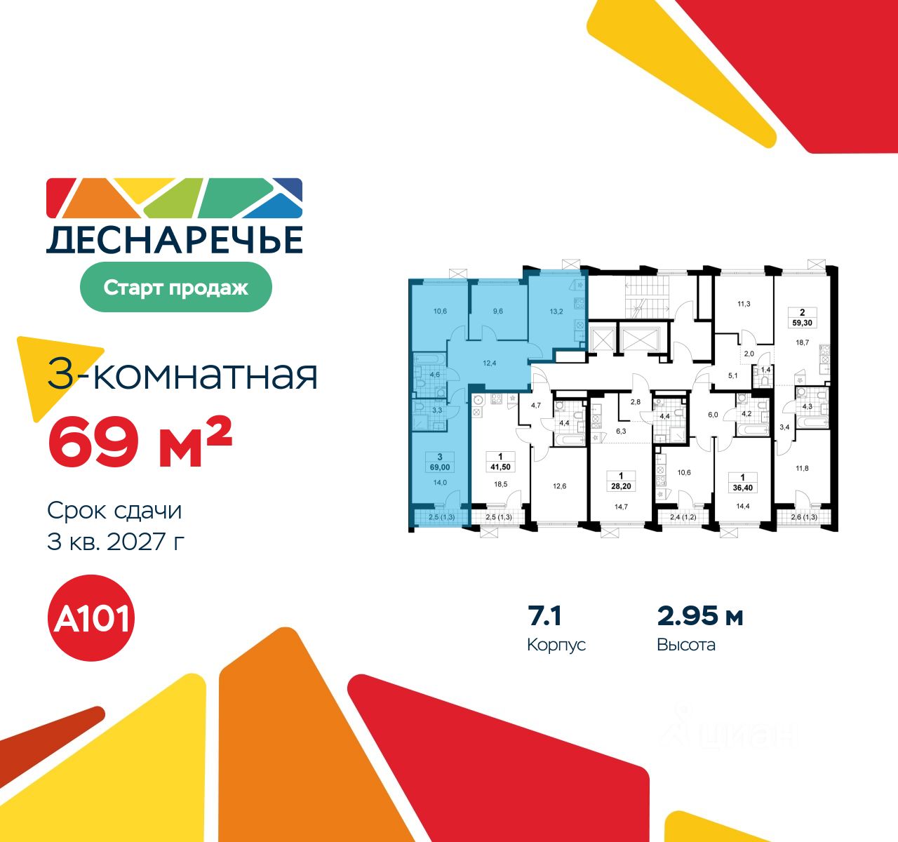Продается трехкомнатная квартира 198 в новостройке ЖК "Деснаречье" по адресу Москва, ТиНАО, Новомосковский АО, Десеновское С/П, Десна деревня, Москва, район Троицк, ЖК Деснаречье, к. 7.1. Общая площадь квартиры - 69.00 кв. м., этаж 2 из 11, секция 4. Тип проекта, по которому построен дом - монолит, компания-застройщик - ООО "А101". Стоимость квартиры - 20030010 Р. Срок сдачи - 3 квартал 2027.
