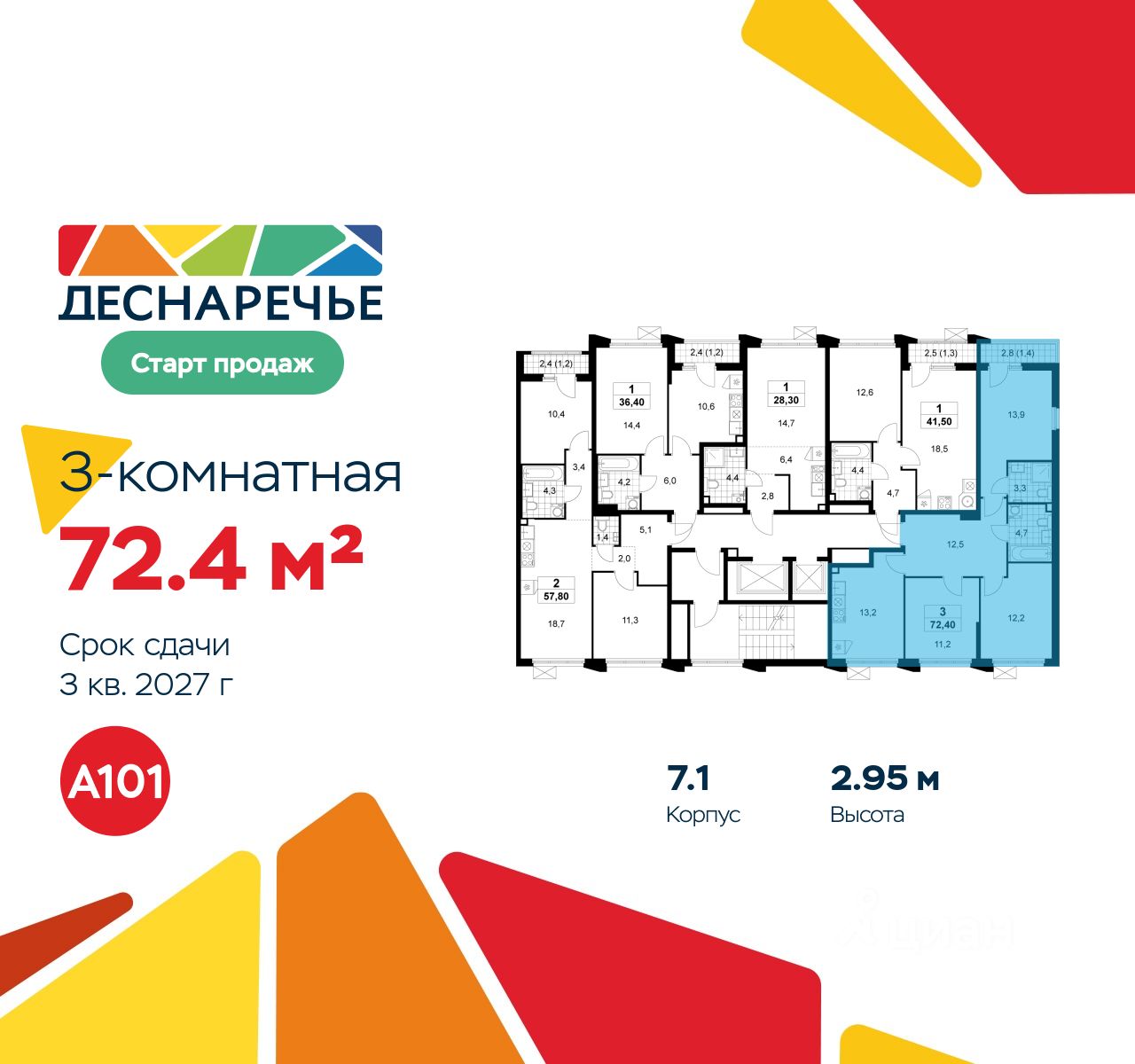 Продается трехкомнатная квартира 70 в новостройке ЖК "Деснаречье" по адресу Москва, ТиНАО, Новомосковский АО, Десеновское С/П, Десна деревня, Москва, район Троицк, ЖК Деснаречье, к. 7.1. Общая площадь квартиры - 72.40 кв. м., этаж 2 из 11, секция 2. Тип проекта, по которому построен дом - монолит, компания-застройщик - ООО "А101". Стоимость квартиры - 18419284 Р. Срок сдачи - 3 квартал 2027.