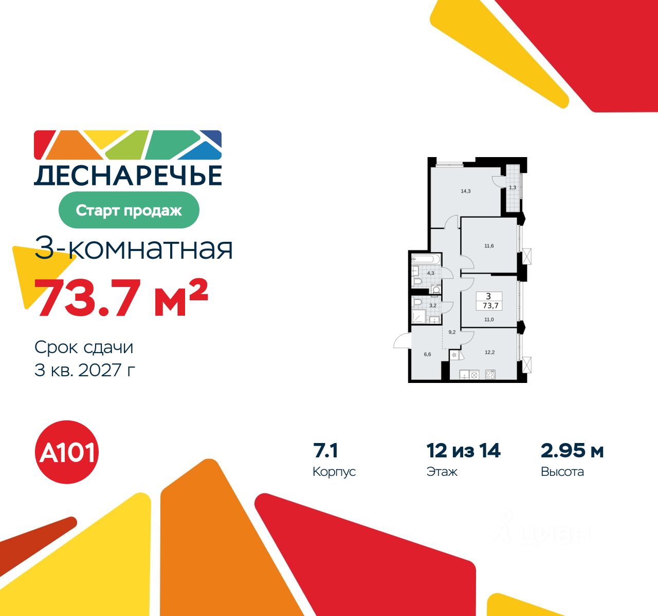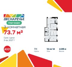 Продается трехкомнатная квартира 179 в новостройке ЖК "Деснаречье" по адресу Москва, ТиНАО, Новомосковский АО, Десеновское С/П, Десна деревня, Москва, район Троицк, ЖК Деснаречье, к. 7.1. Общая площадь квартиры - 73.70 кв. м., этаж 12 из 14, секция 3. Тип проекта, по которому построен дом - монолит, компания-застройщик - ООО "А101". Стоимость квартиры - 16670940 Р. Срок сдачи - 3 квартал 2027.