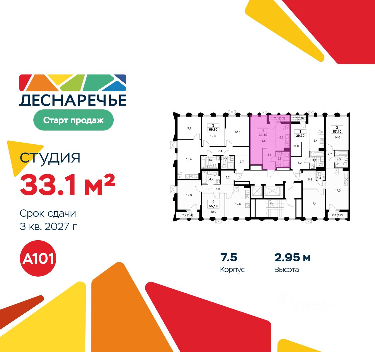 Продается студия 1101 в новостройке ЖК "Деснаречье" по адресу Москва, ТиНАО, Новомосковский АО, Десеновское С/П, Десна деревня, Москва, район Троицк, ЖК Деснаречье, к. 7.5. Общая площадь квартиры - 33.10 кв. м., этаж 10 из 11, секция 16. Тип проекта, по которому построен дом - монолит, компания-застройщик - ООО "А101". Стоимость квартиры - 11981207 Р. Срок сдачи - 3 квартал 2027.