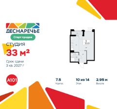 Продается студия 1191 в новостройке ЖК "Деснаречье" по адресу Москва, ТиНАО, Новомосковский АО, Десеновское С/П, Десна деревня, Москва, район Троицк, ЖК Деснаречье, к. 7.5. Общая площадь квартиры - 33.00 кв. м., этаж 10 из 14, секция 18. Тип проекта, по которому построен дом - монолит, компания-застройщик - ООО "А101". Стоимость квартиры - 11753610 Р. Срок сдачи - 3 квартал 2027.