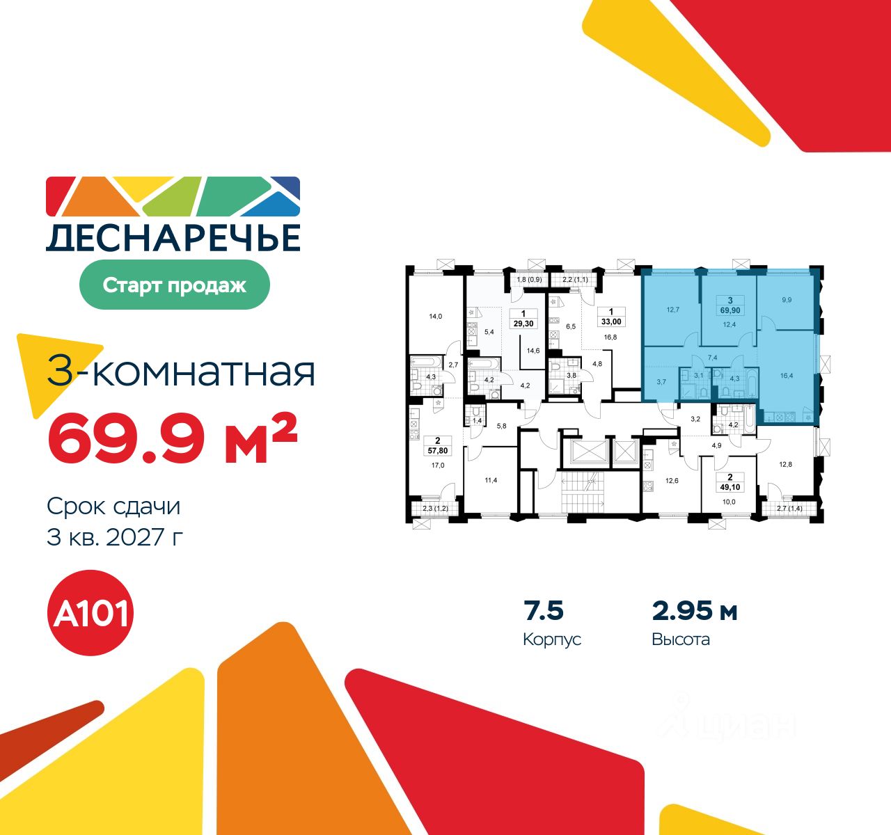 Продается трехкомнатная квартира 1162 в новостройке ЖК "Деснаречье" по адресу Москва, ТиНАО, Новомосковский АО, Десеновское С/П, Десна деревня, Москва, район Троицк, ЖК Деснаречье, к. 7.5. Общая площадь квартиры - 69.90 кв. м., этаж 4 из 14, секция 18. Тип проекта, по которому построен дом - монолит, компания-застройщик - ООО "А101". Стоимость квартиры - 21073452 Р. Срок сдачи - 3 квартал 2027.