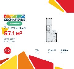 Продается двухкомнатная квартира 1141 в новостройке ЖК "Деснаречье" по адресу Москва, ТиНАО, Новомосковский АО, Десеновское С/П, Десна деревня, Москва, район Троицк, ЖК Деснаречье, к. 7.5. Общая площадь квартиры - 57.10 кв. м., этаж 10 из 11, секция 17. Тип проекта, по которому построен дом - монолит, компания-застройщик - ООО "А101". Стоимость квартиры - 16039390 Р. Срок сдачи - 3 квартал 2027.