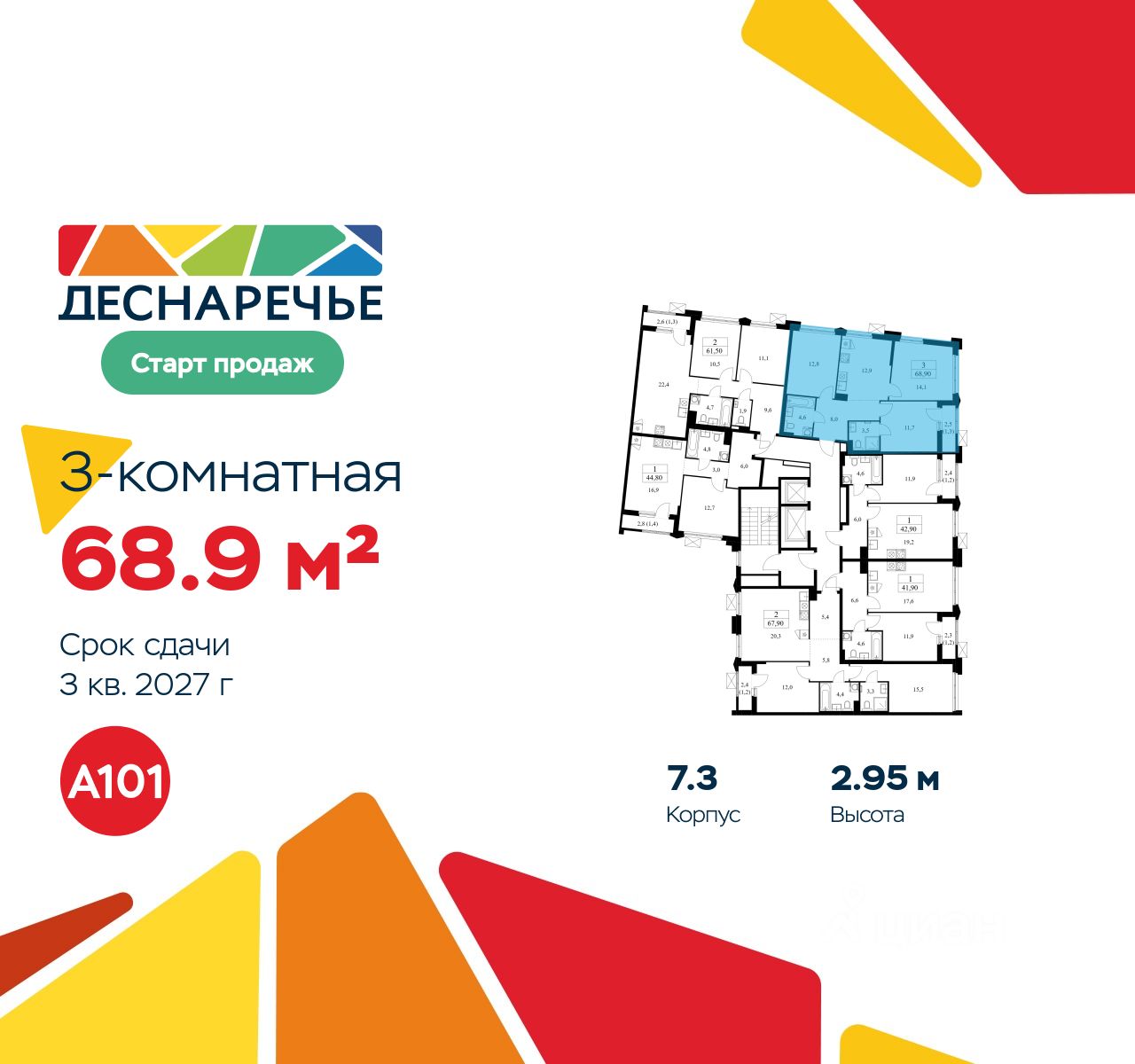 Продается трехкомнатная квартира 707 в новостройке ЖК "Деснаречье" по адресу Москва, ТиНАО, Новомосковский АО, Десеновское С/П, Десна деревня, Москва, район Троицк, ЖК Деснаречье, к. 7.3. Общая площадь квартиры - 68.90 кв. м., этаж 3 из 17, секция 13. Тип проекта, по которому построен дом - монолит, компания-застройщик - ООО "А101". Стоимость квартиры - 18623670 Р. Срок сдачи - 3 квартал 2027.