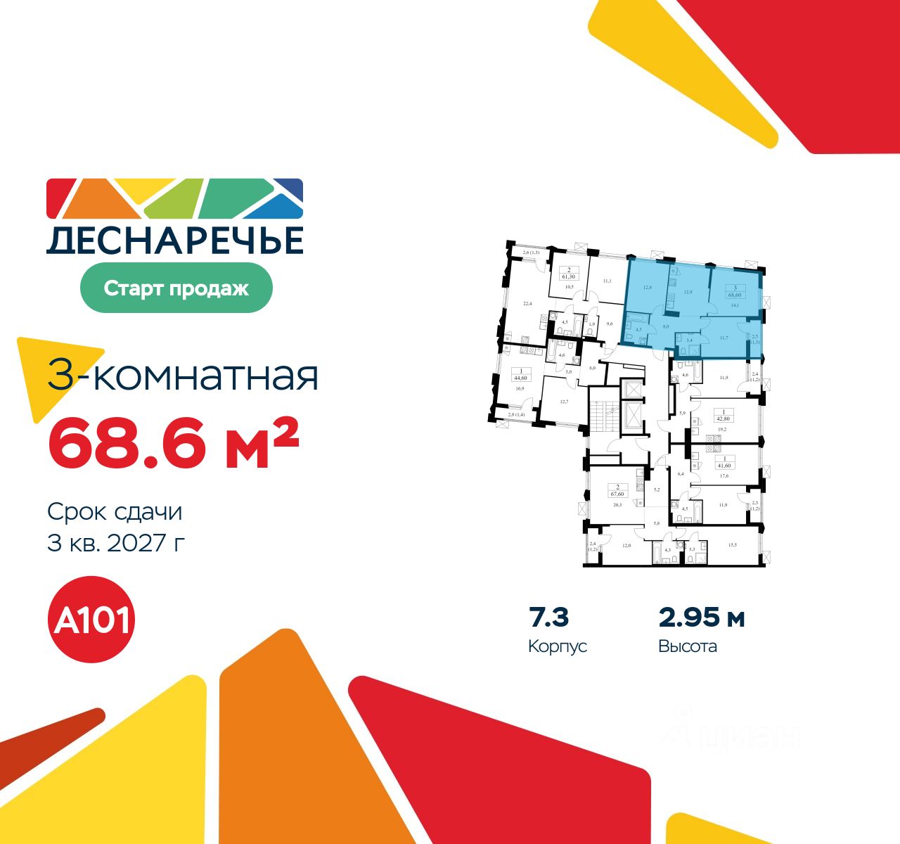 Продается трехкомнатная квартира 773 в новостройке ЖК "Деснаречье" по адресу Москва, ТиНАО, Новомосковский АО, Десеновское С/П, Десна деревня, Москва, район Троицк, ЖК Деснаречье, к. 7.3. Общая площадь квартиры - 68.60 кв. м., этаж 14 из 17, секция 13. Тип проекта, по которому построен дом - монолит, компания-застройщик - ООО "А101". Стоимость квартиры - 20156738 Р. Срок сдачи - 3 квартал 2027.