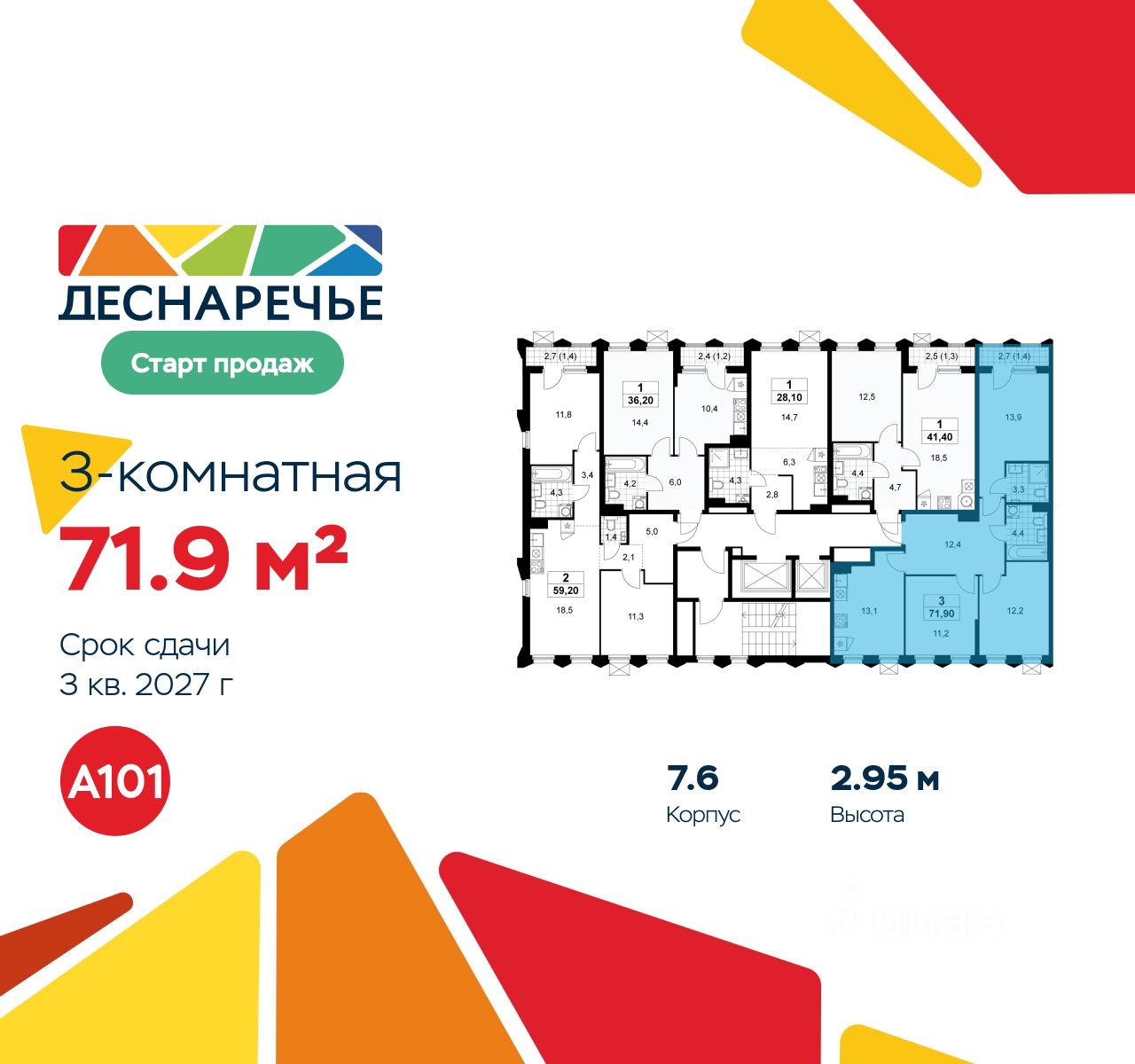 Продается трехкомнатная квартира 1253 в новостройке ЖК "Деснаречье" по адресу Москва, ТиНАО, Новомосковский АО, Десеновское С/П, Десна деревня, Москва, район Троицк, ЖК Деснаречье, к. 7.6. Общая площадь квартиры - 71.90 кв. м., этаж 9 из 11, секция 19. Тип проекта, по которому построен дом - монолит, компания-застройщик - ООО "А101". Стоимость квартиры - 23059768 Р. Срок сдачи - 3 квартал 2027.