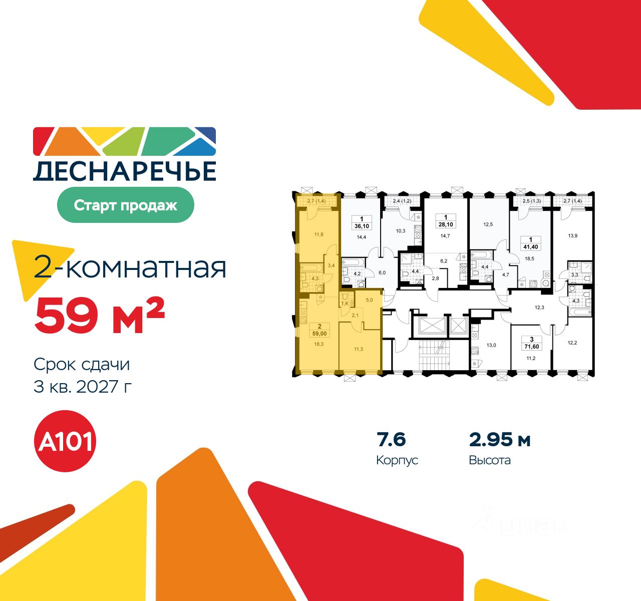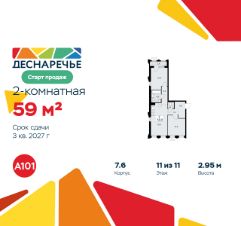 Продается двухкомнатная квартира 1259 в новостройке ЖК "Деснаречье" по адресу Москва, ТиНАО, Новомосковский АО, Десеновское С/П, Десна деревня, Москва, район Троицк, ЖК Деснаречье, к. 7.6. Общая площадь квартиры - 59.00 кв. м., этаж 11 из 11, секция 19. Тип проекта, по которому построен дом - монолит, компания-застройщик - ООО "А101". Стоимость квартиры - 16665140 Р. Срок сдачи - 3 квартал 2027.