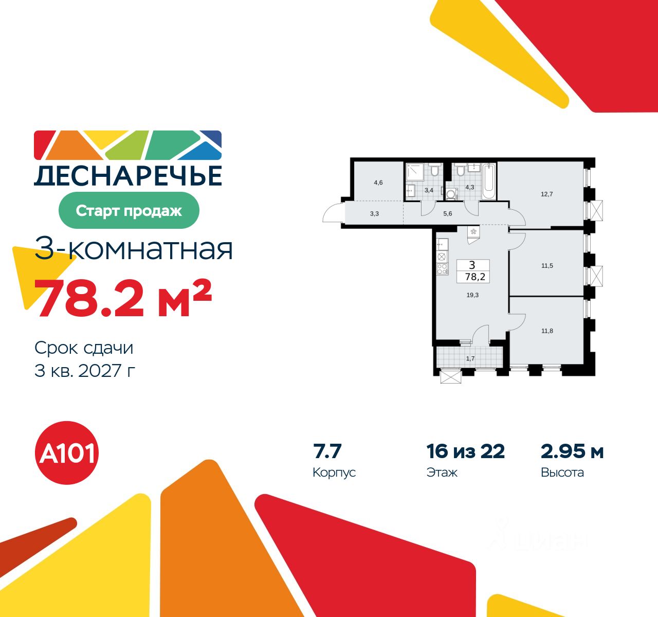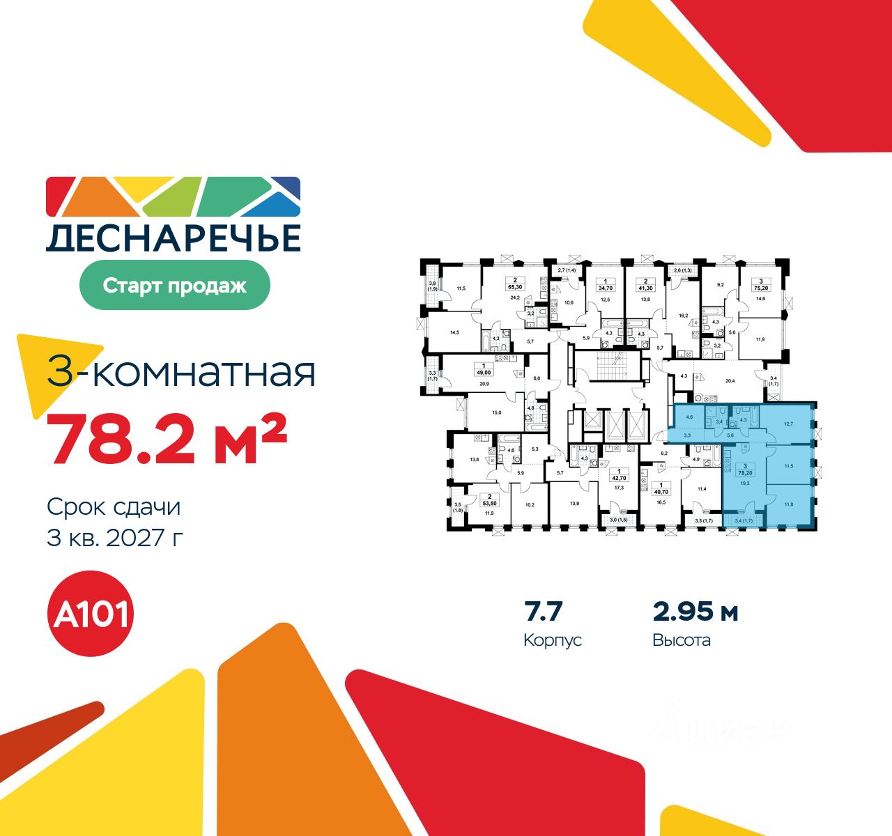 Продается трехкомнатная квартира 1447 в новостройке ЖК "Деснаречье" по адресу Москва, ТиНАО, Новомосковский АО, Десеновское С/П, Десна деревня, Москва, район Троицк, ЖК Деснаречье, к. 7.7. Общая площадь квартиры - 78.20 кв. м., этаж 16 из 22, секция 21. Тип проекта, по которому построен дом - монолит, компания-застройщик - ООО "А101". Стоимость квартиры - 21222698 Р. Срок сдачи - 3 квартал 2027.