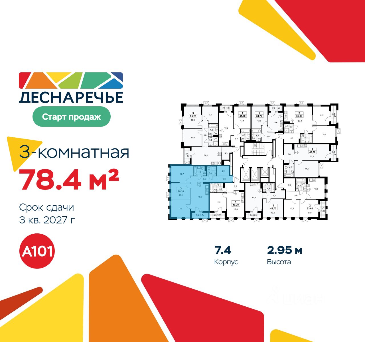 Продается трехкомнатная квартира 961 в новостройке ЖК "Деснаречье" по адресу Москва, ТиНАО, Новомосковский АО, Десеновское С/П, Десна деревня, Москва, район Троицк, ЖК Деснаречье, к. 7.4. Общая площадь квартиры - 78.40 кв. м., этаж 12 из 22, секция 15. Тип проекта, по которому построен дом - монолит, компания-застройщик - ООО "А101". Стоимость квартиры - 20785408 Р. Срок сдачи - 3 квартал 2027.