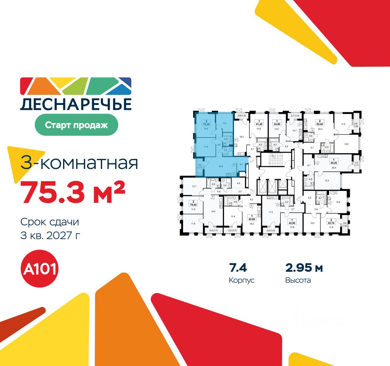 Продается трехкомнатная квартира 935 в новостройке ЖК "Деснаречье" по адресу Москва, ТиНАО, Новомосковский АО, Десеновское С/П, Десна деревня, Москва, район Троицк, ЖК Деснаречье, к. 7.4. Общая площадь квартиры - 75.30 кв. м., этаж 9 из 22, секция 15. Тип проекта, по которому построен дом - монолит, компания-застройщик - ООО "А101". Стоимость квартиры - 21290322 Р. Срок сдачи - 3 квартал 2027.