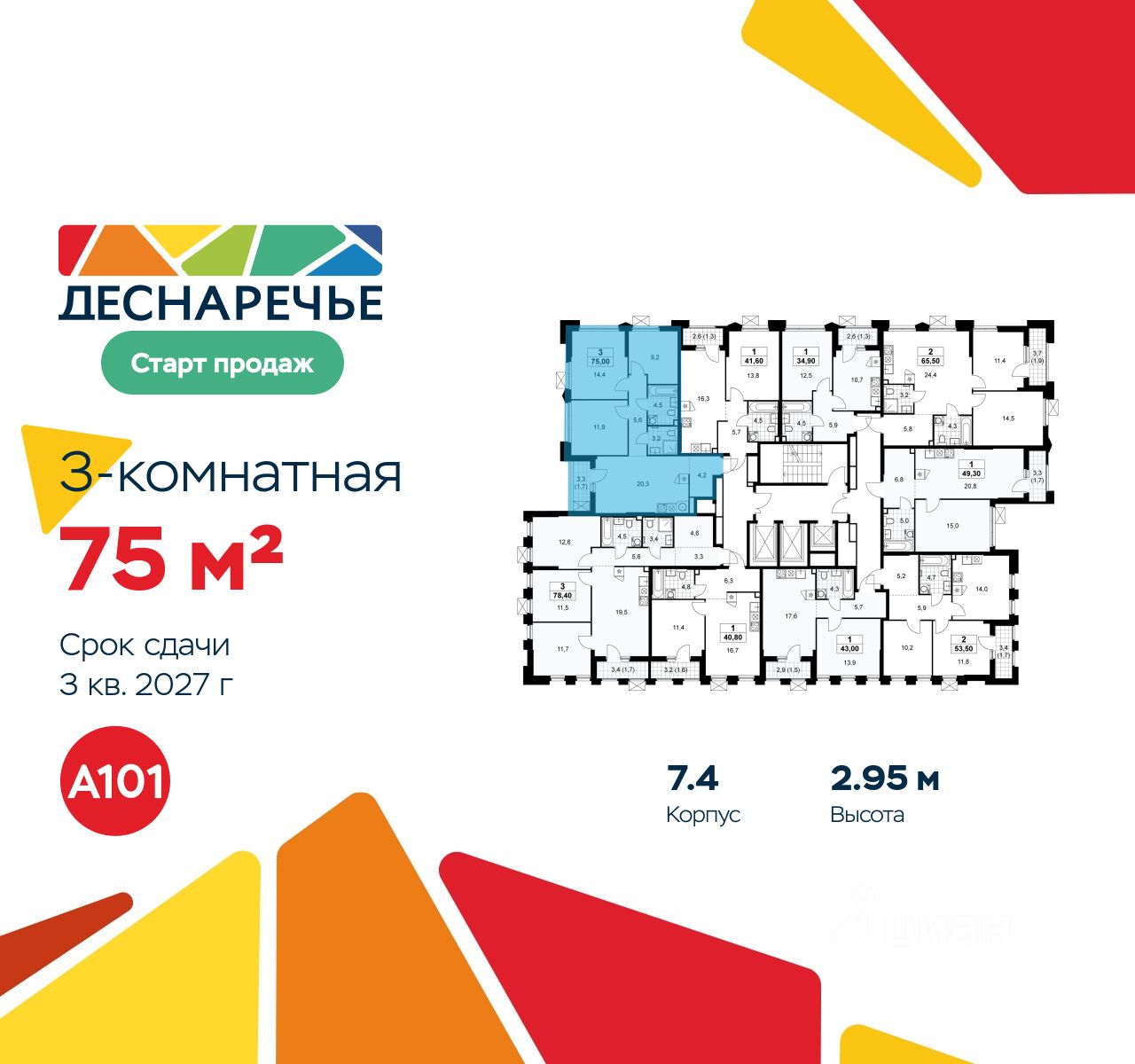 Продается трехкомнатная квартира 872 в новостройке ЖК "Деснаречье" по адресу Москва, ТиНАО, Новомосковский АО, Десеновское С/П, Десна деревня, Москва, район Троицк, ЖК Деснаречье, к. 7.4. Общая площадь квартиры - 75.00 кв. м., этаж 2 из 22, секция 15. Тип проекта, по которому построен дом - монолит, компания-застройщик - ООО "А101". Стоимость квартиры - 19868250 Р. Срок сдачи - 3 квартал 2027.