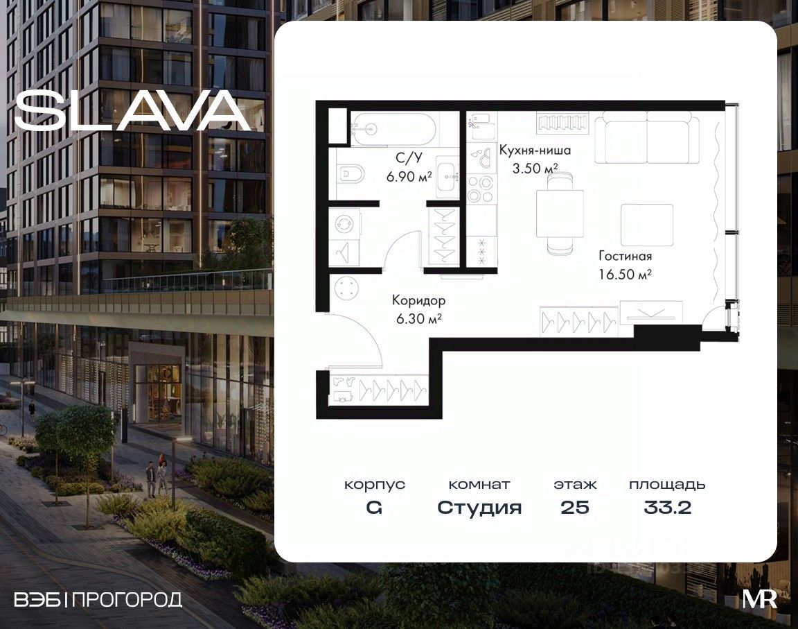 В продаже студия площадью 33.20 м² на 25-м этаже корпуса G.