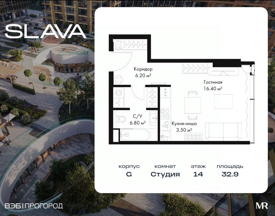В продаже студия площадью 32.90 м² на 14-м этаже корпуса G.