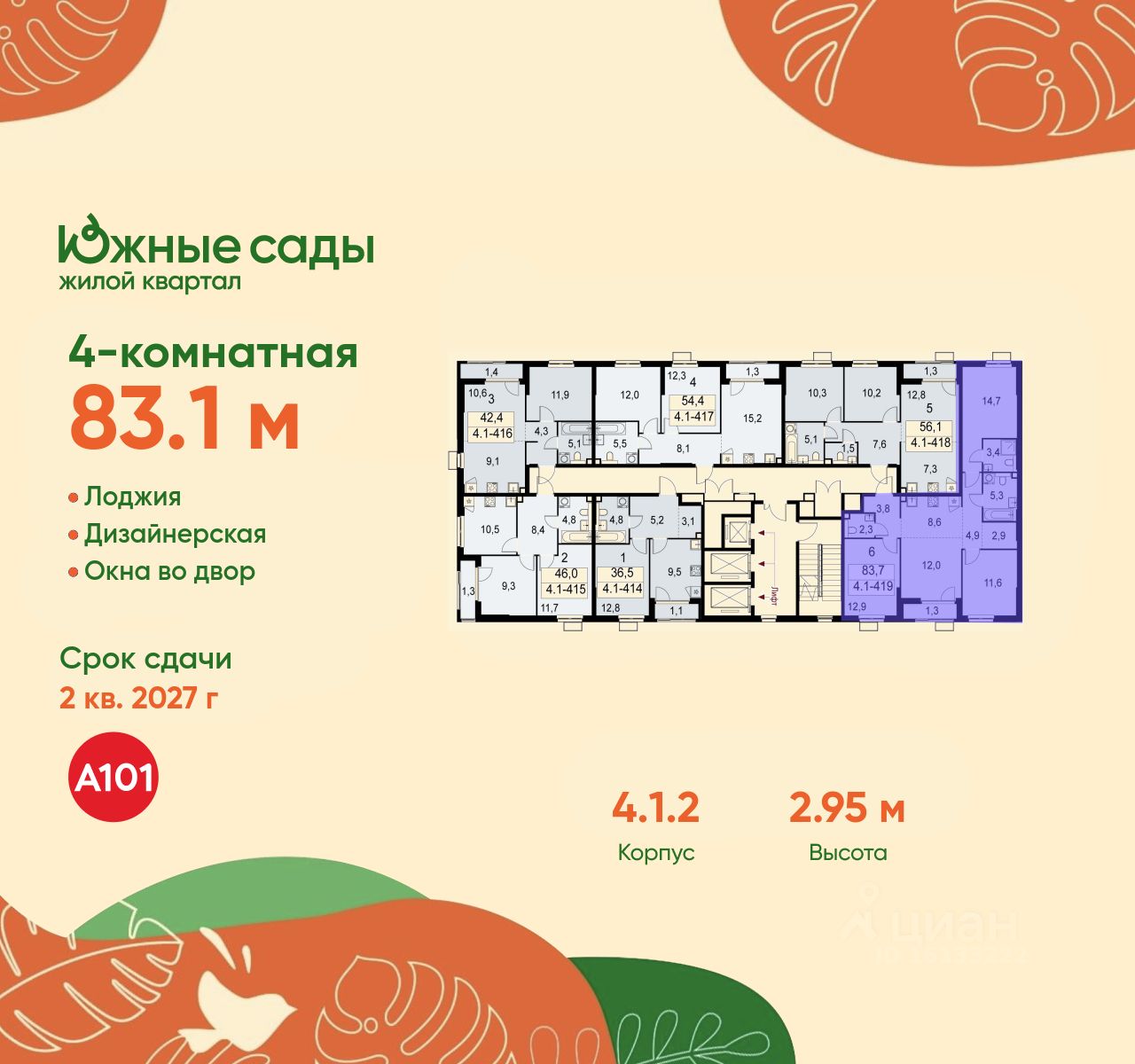 Продается четырехкомнатная квартира 521 в новостройке ЖК "Южные Сады" по адресу Москва, ЮЗАО, Южное Бутово, ул. Бартеневская, д. 16. Общая площадь квартиры - 83.10 кв. м., этаж 19 из 22, секция 5. Тип проекта, по которому построен дом - монолит, компания-застройщик - ООО "А101". Стоимость квартиры - 28120209 Р. Срок сдачи - 2 квартал 2027.