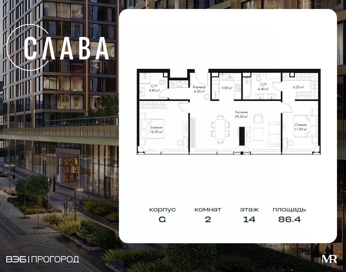 В продаже 2-комнатная квартира площадью 86.40 м² на 14-м этаже корпуса G.