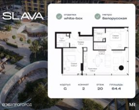 В продаже 2-комнатная квартира площадью 64.40 м² на 20-м этаже корпуса G.
