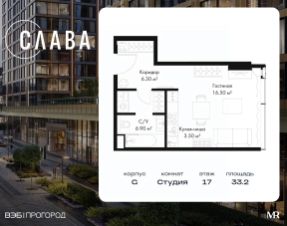 В продаже студия площадью 33.20 м² на 17-м этаже корпуса G.