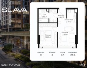 В продаже 1-комнатная квартира площадью 38.10 м² на 14-м этаже корпуса G.