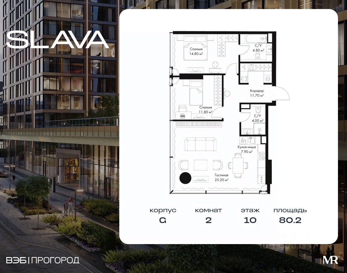 В продаже 2-комнатная квартира площадью 80.20 м² на 10-м этаже корпуса G.