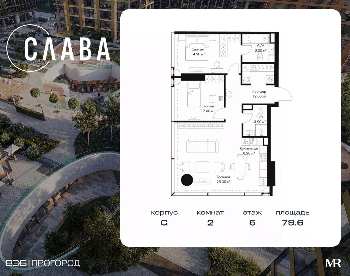 В продаже 2-комнатная квартира площадью 79.60 м² на 5-м этаже корпуса G.