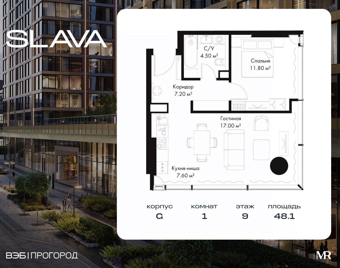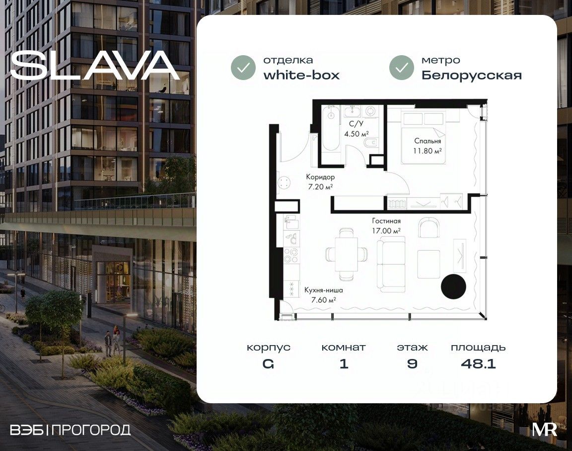 В продаже 1-комнатная квартира площадью 48.10 м² на 9-м этаже корпуса G.