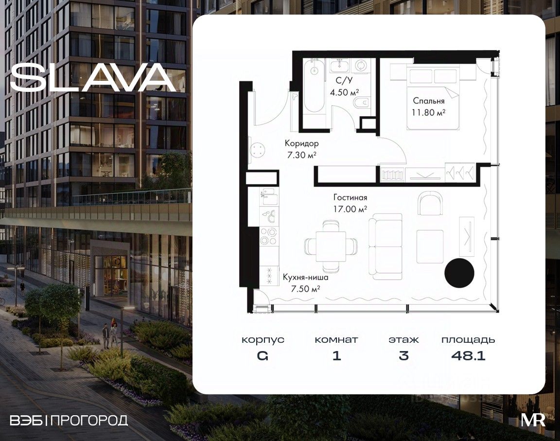 В продаже 1-комнатная квартира площадью 48.10 м² на 3-м этаже корпуса G.
