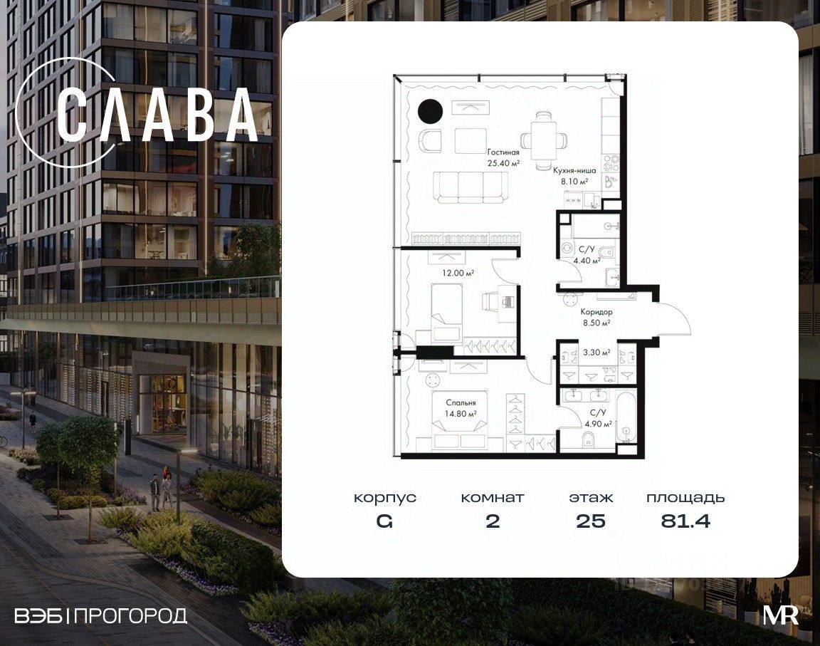 В продаже 2-комнатная квартира площадью 81.40 м² на 25-м этаже корпуса G.