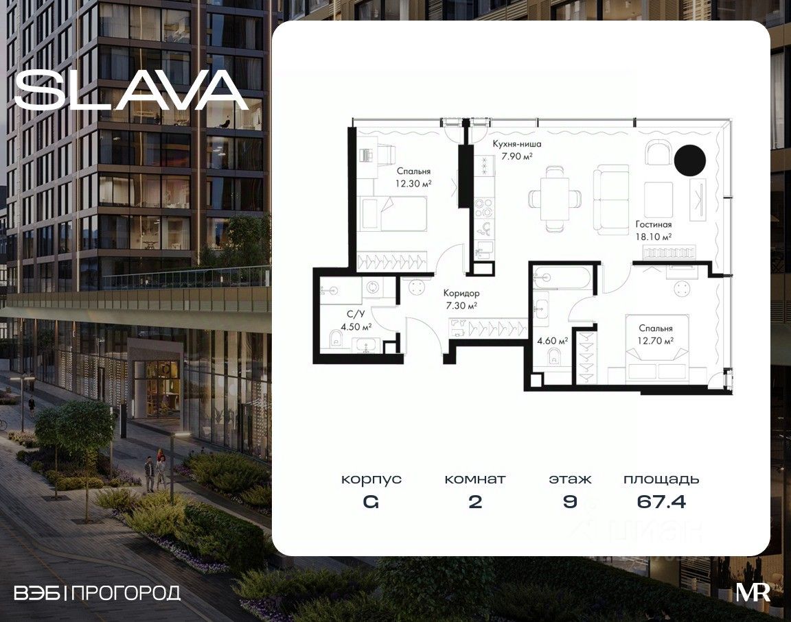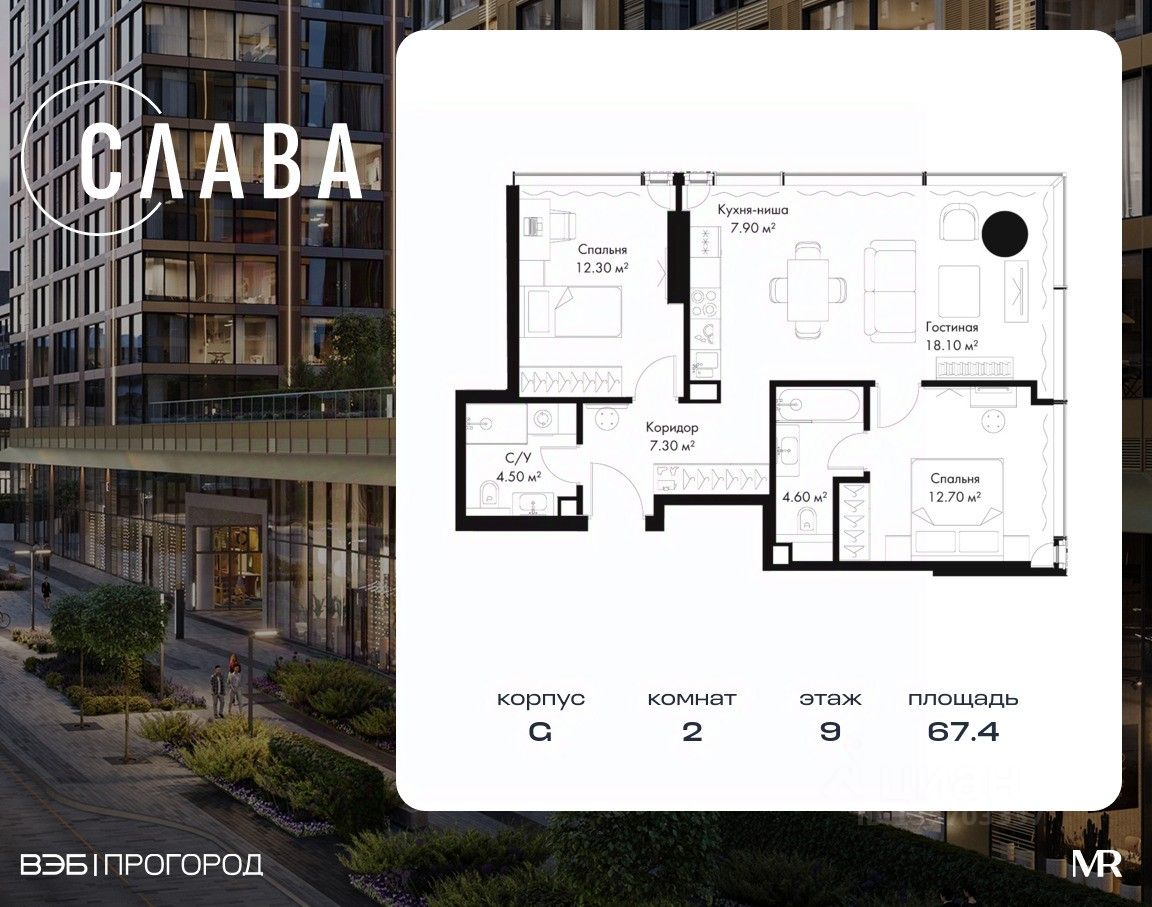 В продаже 2-комнатная квартира площадью 67.40 м² на 9-м этаже корпуса G.