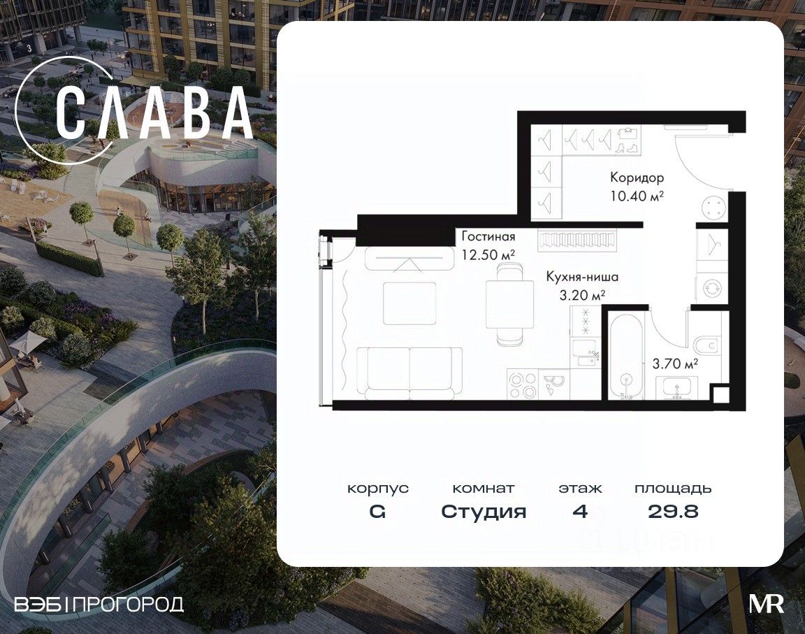 В продаже студия площадью 29.80 м² на 4-м этаже корпуса G.