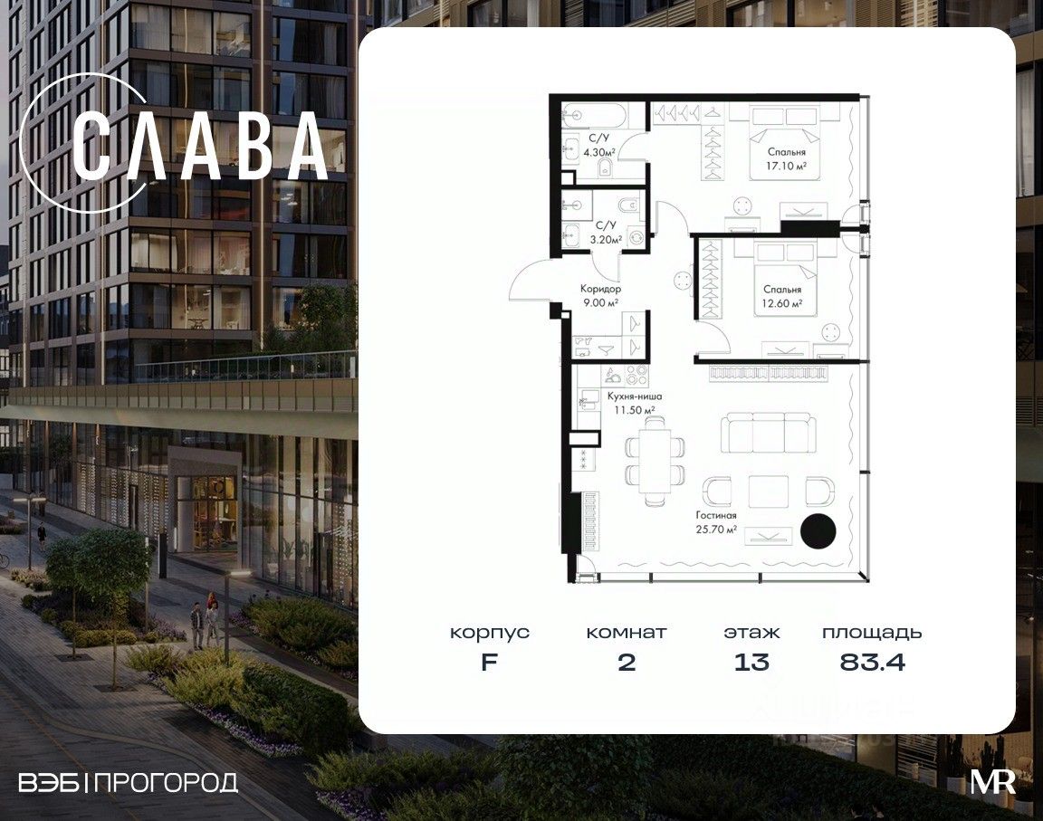 В продаже 2-комнатная квартира площадью 83.40 м² на 13-м этаже корпуса F.