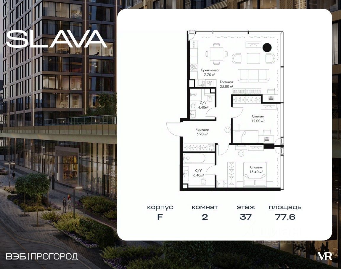 В продаже 2-комнатная квартира площадью 77.60 м² на 37-м этаже корпуса F.