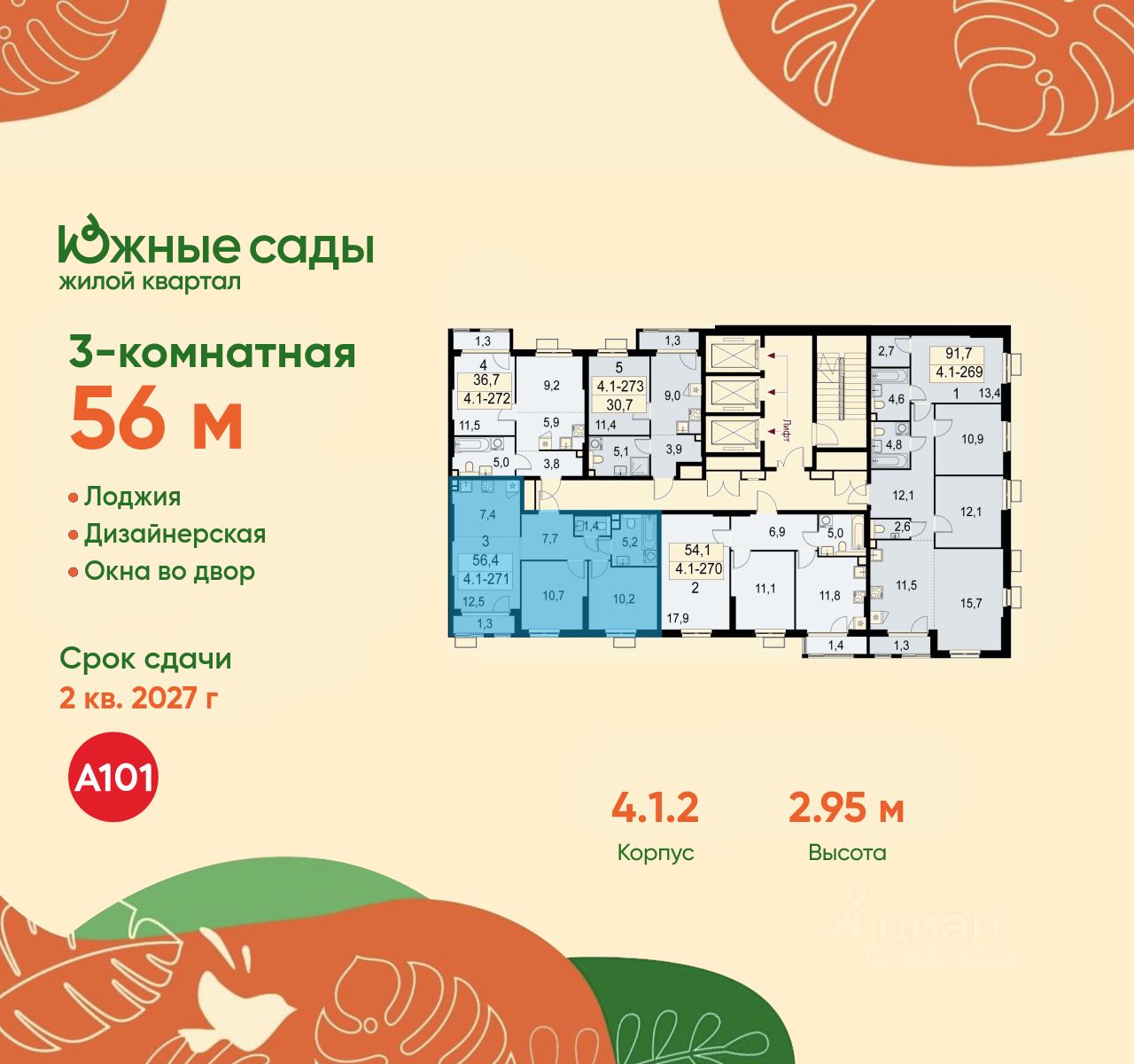 Продается трехкомнатная квартира 401 в новостройке ЖК "Южные Сады" по адресу Москва, ЮЗАО, Южное Бутово, ул. Бартеневская, д. 16. Общая площадь квартиры - 56.00 кв. м., этаж 28 из 30, секция 4. Тип проекта, по которому построен дом - монолит, компания-застройщик - ООО "А101". Стоимость квартиры - 22798160 Р. Срок сдачи - 2 квартал 2027.