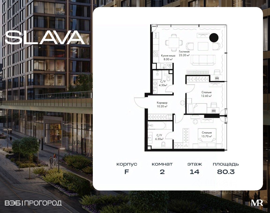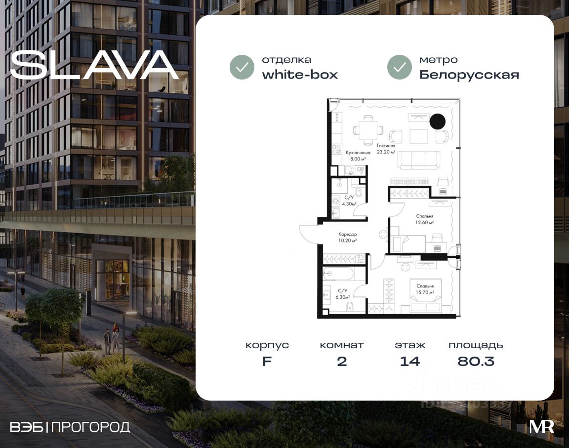 В продаже 2-комнатная квартира площадью 80.30 м² на 14-м этаже корпуса F.