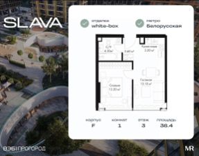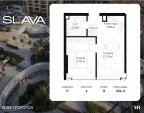 В продаже 1-комнатная квартира площадью 36.40 м² на 3-м этаже корпуса F.
