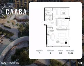 В продаже 2-комнатная квартира площадью 81.50 м² на 35-м этаже корпуса F.