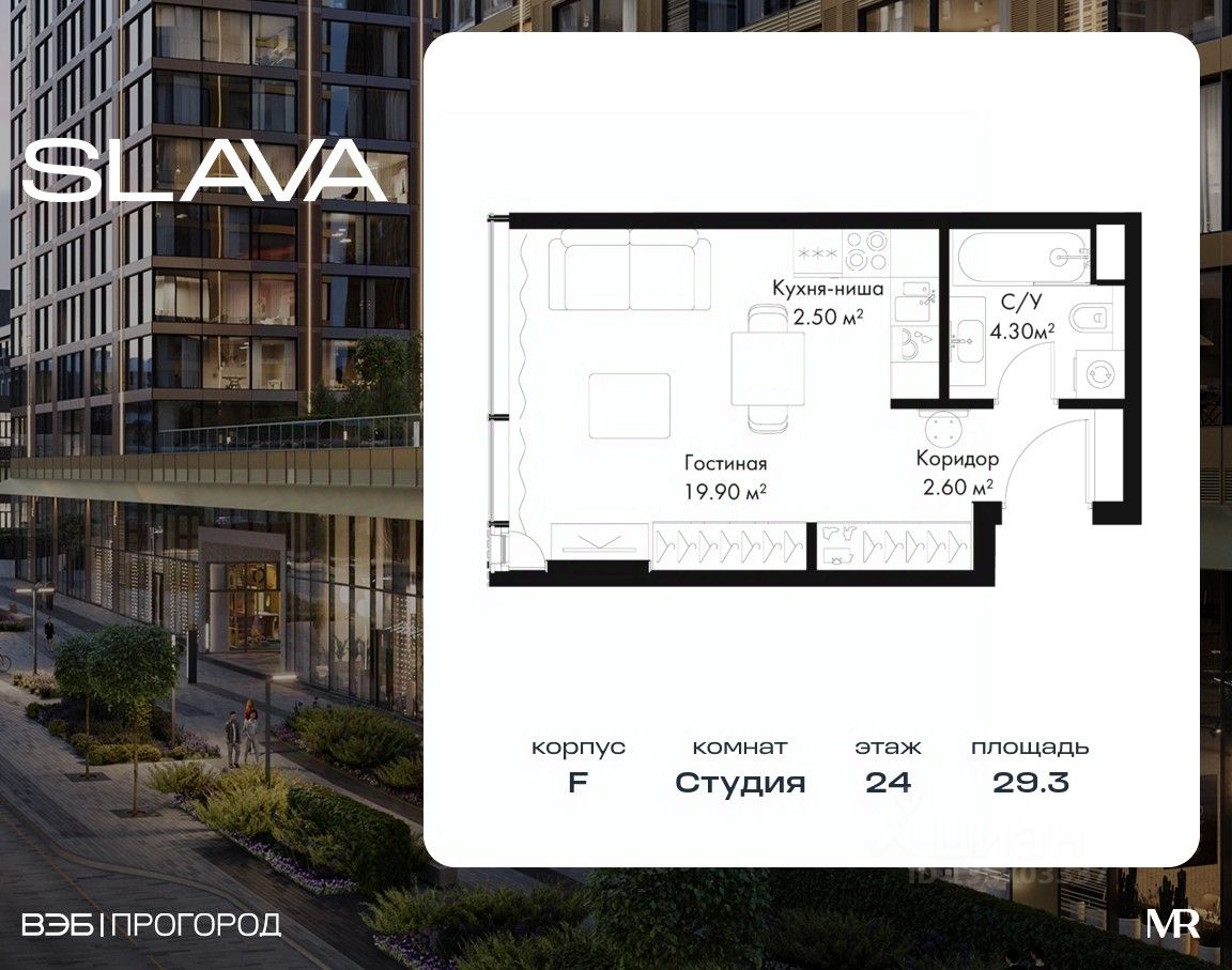 В продаже студия площадью 29.30 м² на 24-м этаже корпуса F.