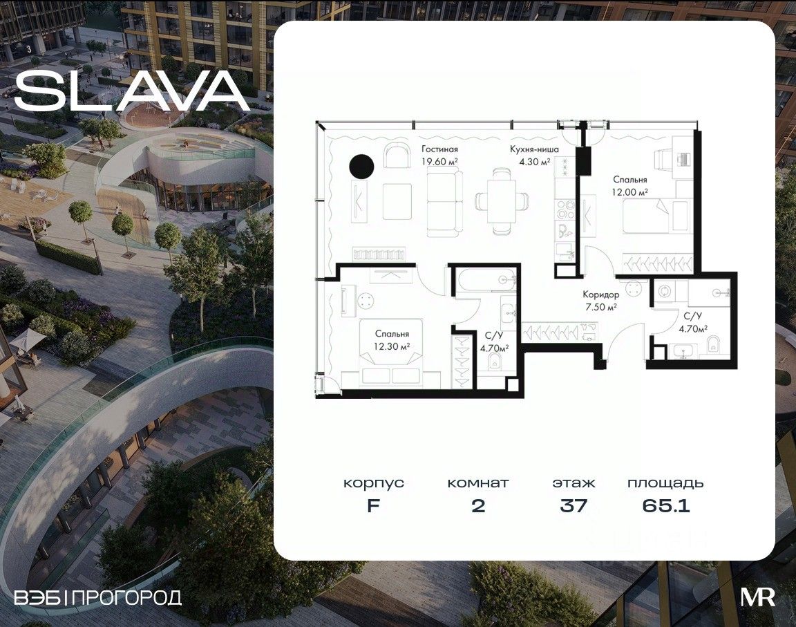 В продаже 2-комнатная квартира площадью 65.10 м² на 37-м этаже корпуса F.