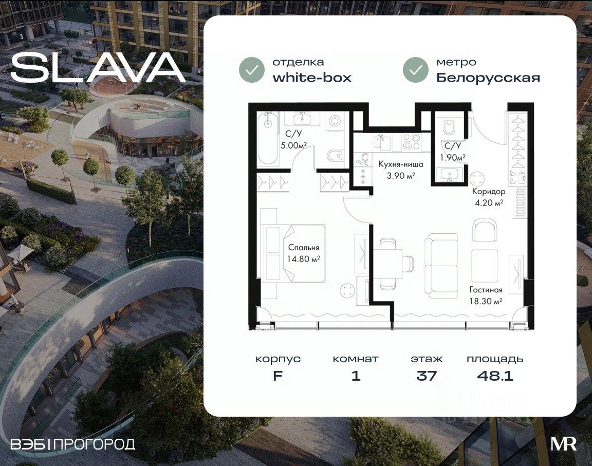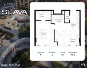 В продаже 1-комнатная квартира площадью 48.10 м² на 37-м этаже корпуса F.