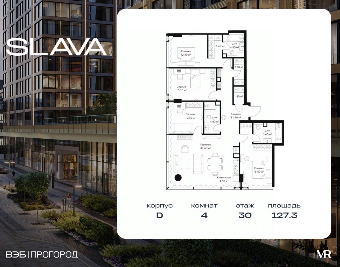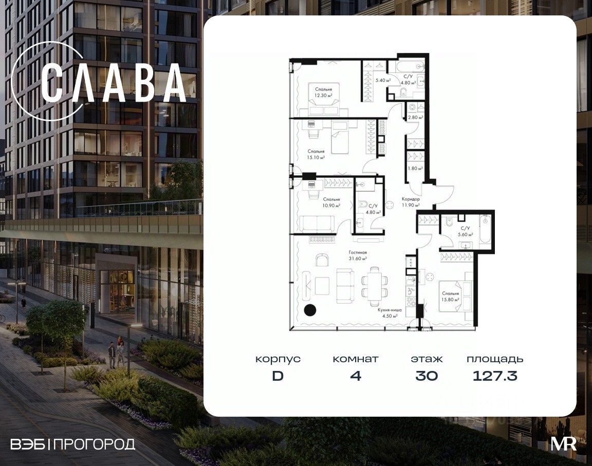 В продаже 4-комнатная квартира площадью 127.30 м² на 30-м этаже корпуса D.