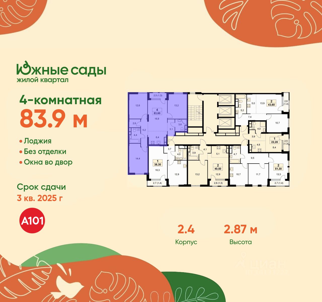 Продается четырехкомнатная квартира 1099 в новостройке ЖК "Южные Сады" по адресу Москва, ЮЗАО, Южное Бутово, Жилой комплекс "Южные Сады", корп.2.4. Общая площадь квартиры - 83.90 кв. м., этаж 13 из 30, секция 9. Тип проекта, по которому построен дом - монолит, компания-застройщик - ООО "А101". Стоимость квартиры - 27703780 Р. Срок сдачи - 4 квартал 2025.