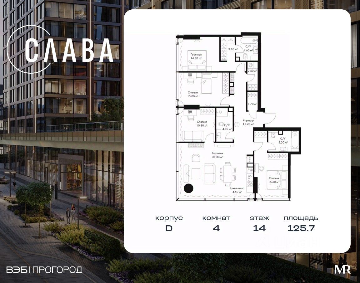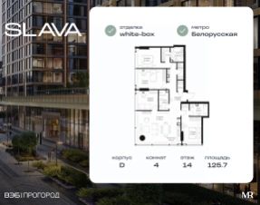 В продаже 4-комнатная квартира площадью 125.70 м² на 14-м этаже корпуса D.