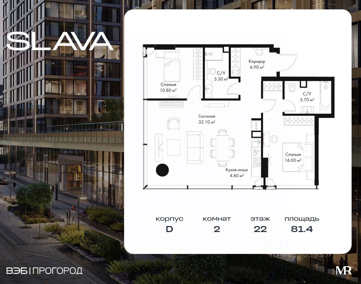 В продаже 2-комнатная квартира площадью 81.40 м² на 22-м этаже корпуса D.