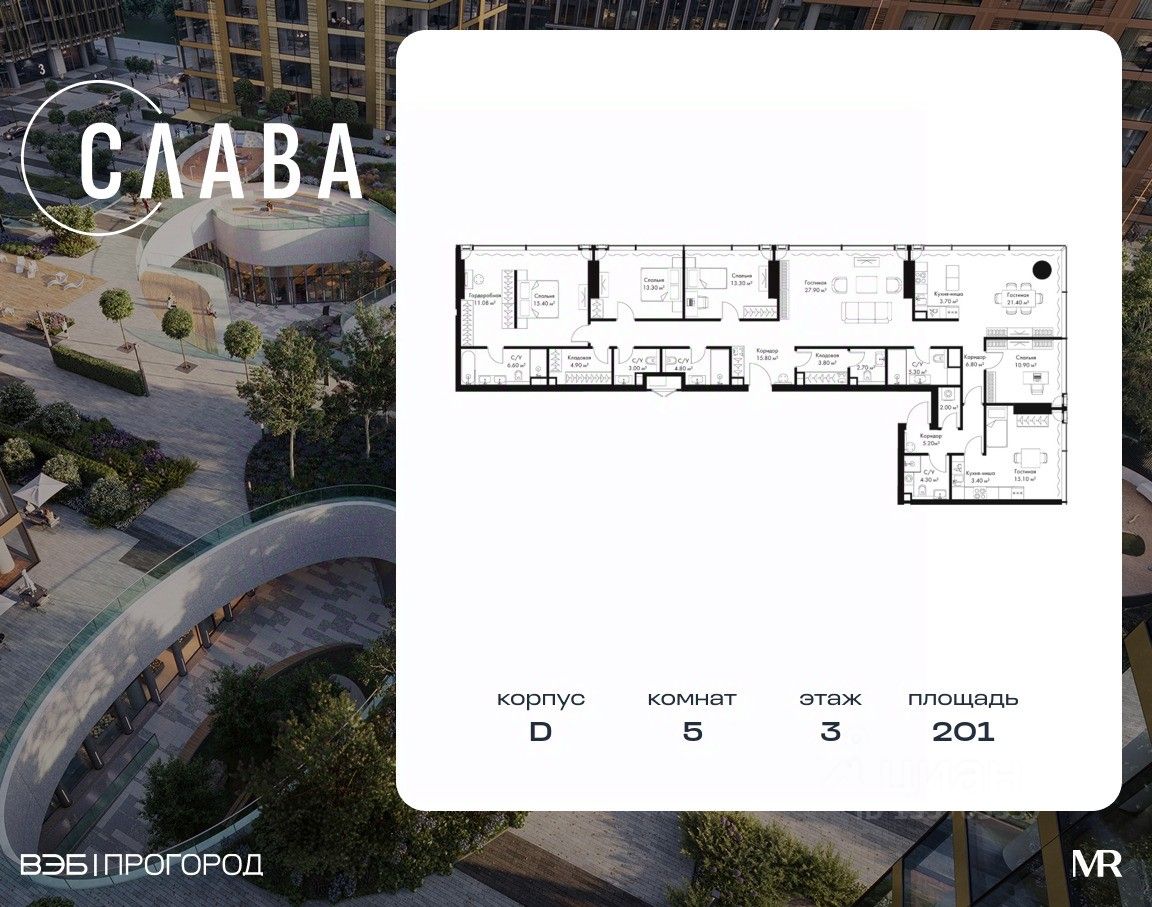 В продаже 5-комнатная квартира площадью 201 м² на 3-м этаже корпуса D.