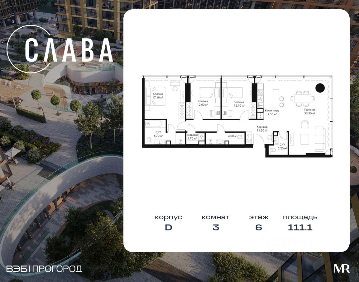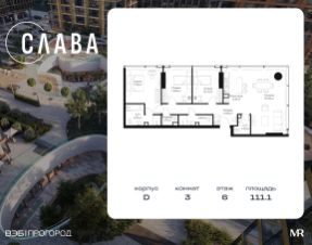 В продаже 3-комнатная квартира площадью 111.10 м² на 6-м этаже корпуса D.