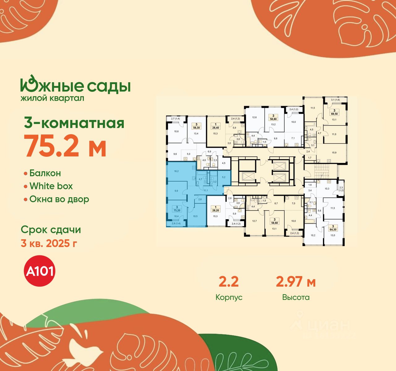 Продается трехкомнатная квартира 522 в новостройке ЖК "Южные Сады" по адресу Москва, ЮЗАО, Южное Бутово, Жилой комплекс "Южные Сады", корп.2.2. Общая площадь квартиры - 75.20 кв. м., этаж 28 из 30, секция 4. Тип проекта, по которому построен дом - монолит, компания-застройщик - ООО "А101". Стоимость квартиры - 30361248 Р. Срок сдачи - 4 квартал 2025.