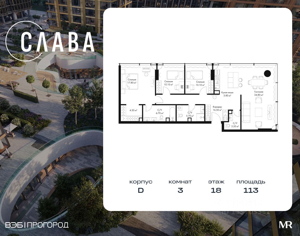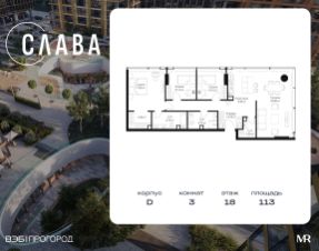 В продаже 3-комнатная квартира площадью 113 м² на 18-м этаже корпуса D.