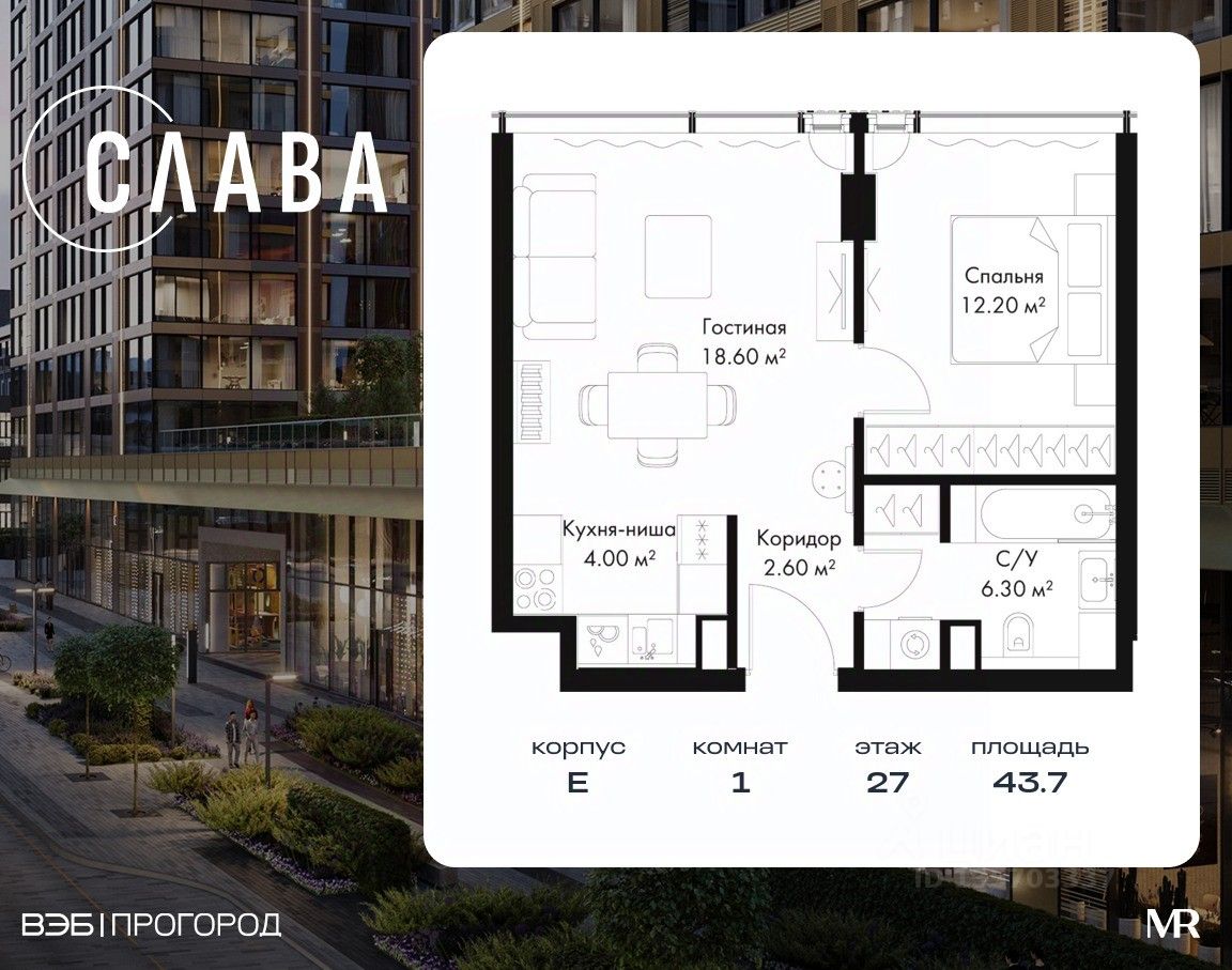 В продаже 1-комнатная квартира площадью 43.70 м² на 27-м этаже корпуса E.