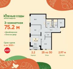 Продается трехкомнатная квартира 498 в новостройке ЖК "Южные Сады" по адресу Москва, ЮЗАО, Южное Бутово, Жилой комплекс "Южные Сады", корп.2.2. Общая площадь квартиры - 75.20 кв. м., этаж 25 из 30, секция 4. Тип проекта, по которому построен дом - монолит, компания-застройщик - ООО "А101". Стоимость квартиры - 28322576 Р. Срок сдачи - 4 квартал 2025.