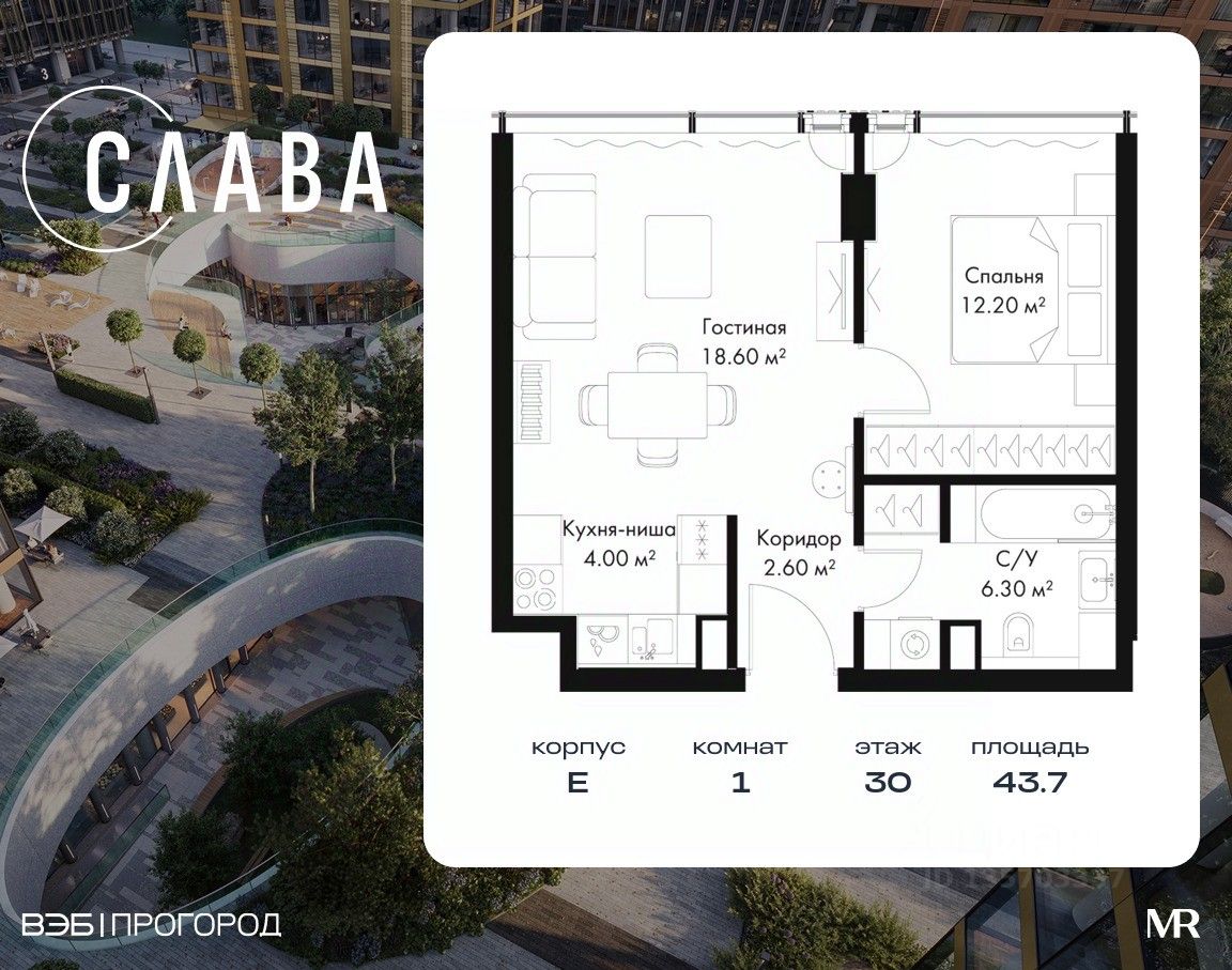 Квартиры премиум-класса в жилом комплексе Слава у м. "Белорусская" от застройщика. В продаже 1-комнатная квартира площадью 43.70 м² на 30-м этаже корпуса E. Новый современный жилой комплекс премиум-класса Слава расположен в той части центра, где традиция соединяется с прогрессивными городскими тенденциями. Здесь историческая Москва встречается с передовым миром. Популярные театры и старинные церкви соседствуют с современным деловым кварталом и гастрономическим кластером Депо. Слава находится всего в 5 мин. пешком от м. "Белорусская", по-новому открывая Ленинградский проспект. Проект был разработан легендарным архитектором Хельмутом Яном, основателем чикагского архитектурного бюро Jahn. Его работы отмечены множеством наград и реализованы в мегаполисах по всему миру. По замыслу архитекторов, жилой комплекс образуют четыре высотные башни, соединенные одноэтажным стилобатом "Хронограф". Здесь, на первом уровне, открытые и закрытые общественные пространства: небольшие сады, места для встреч и отдыха, кафе, рестораны, магазины, спортивный центр и даже выставочное пространство. Важнейшей особенностью пространства является его всесезонность: благодаря правильной организации, ландшафтному дизайну, инженерной инфраструктуре здесь будет уютно и в жару, и в xолод, и в ненастье. На втором уровне стилобата расположится приватный парк для жильцов. Особенности комплекса: - Идеальное расположение в престижной части Москвы (10 мин. от Кремля) - Панорамное остекление - Подземный паркинг с дизайнерской отделкой - Современные инженерные системы - Продуманная внутренняя инфраструктура - Приватный сад 7700 кв.м. Расположение комплекса: - 5 минут до станции метро "Белорусская" - 3 минуты до ТТК - 8 минут до "Садового кольца" Компания MR предлагает своим клиентам специальные условия приобретения квартир в рамках программ ипотечного кредитования от банков-партнеров.
